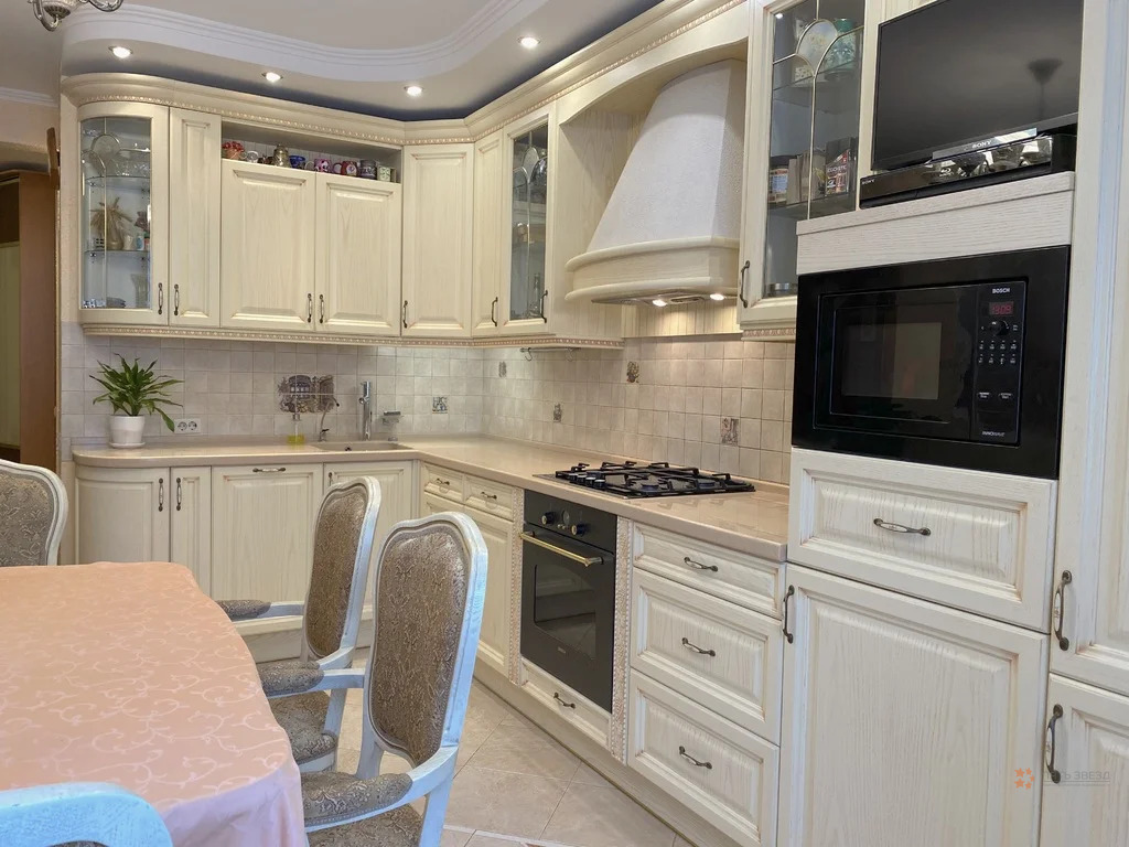 + Просторная светлая кухня – настоящий центр притяжения всей семьи. Установлена продуманная до мелочей, дорогостоящая встроенная кухня из массива дерева с единой столешницей без швов. Вся необходимая техника встроена (холодильник, морозильная камера, посудомоечная машина, микроволновка, духовой шкаф, варочная панель, вытяжка).