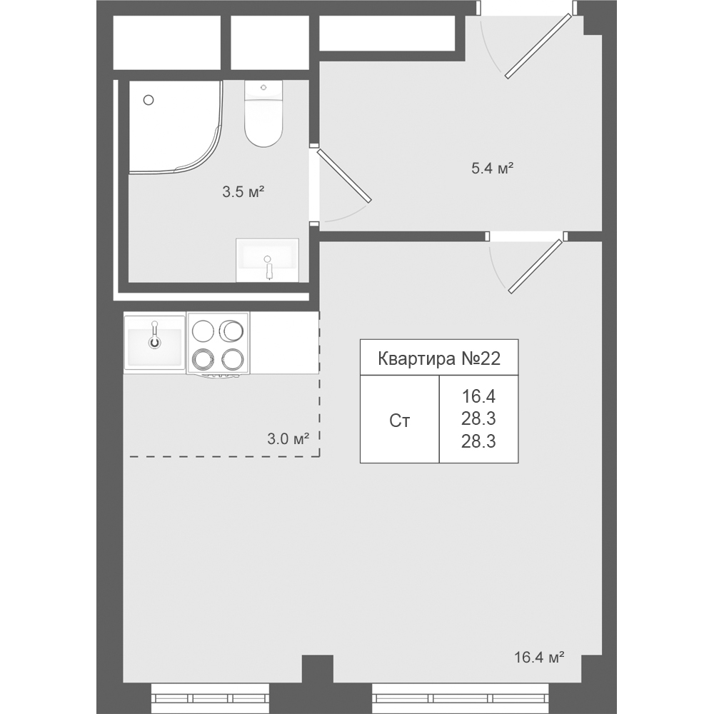 Продается студия площадью 28.3 кв.м. на 3-м этаже