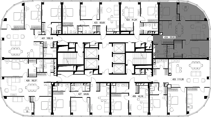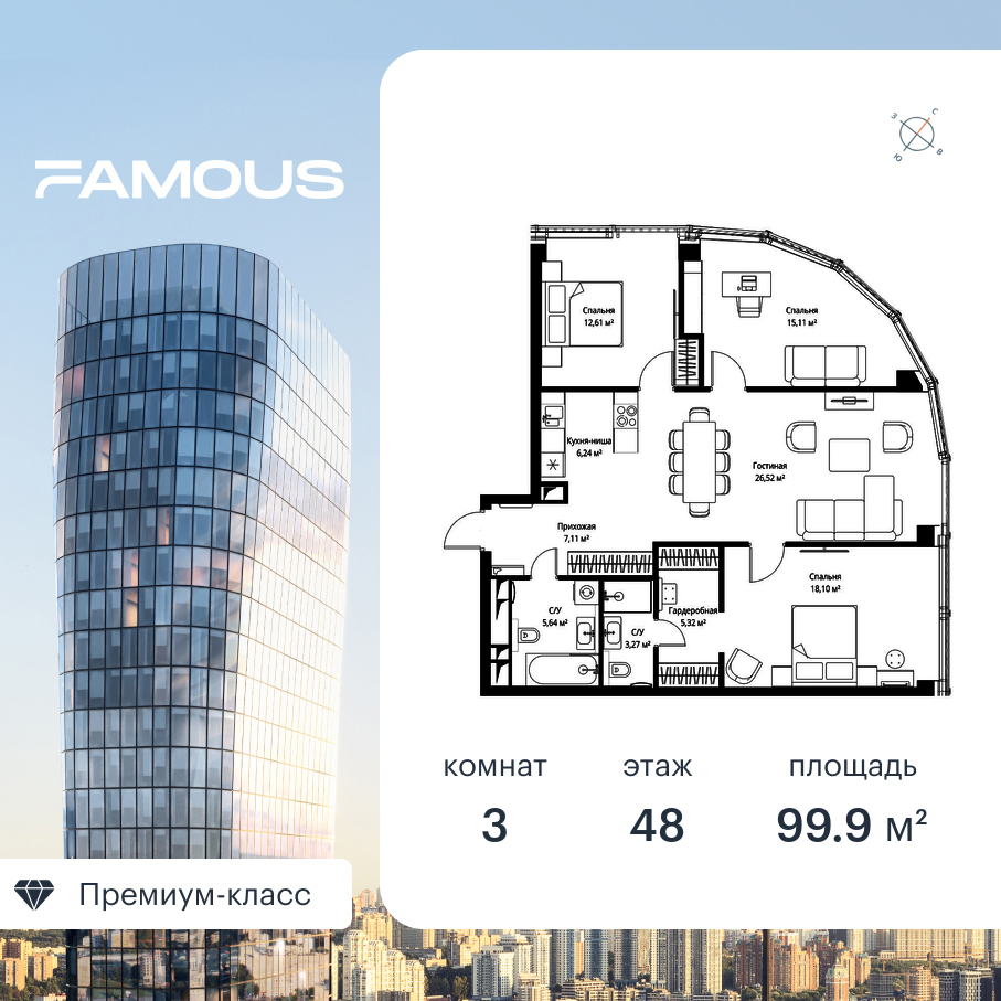Продаётся 3-к квартира общей площадью 99.92 кв. м с предчистовой отделкой на 48-м этаже премиального небоскреба Famous.