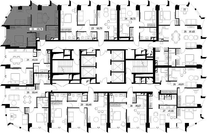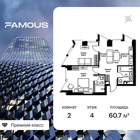 Продаётся 2-к квартира общей площадью 60.78 кв. м с предчистовой отделкой на 4-м этаже премиального небоскреба Famous.