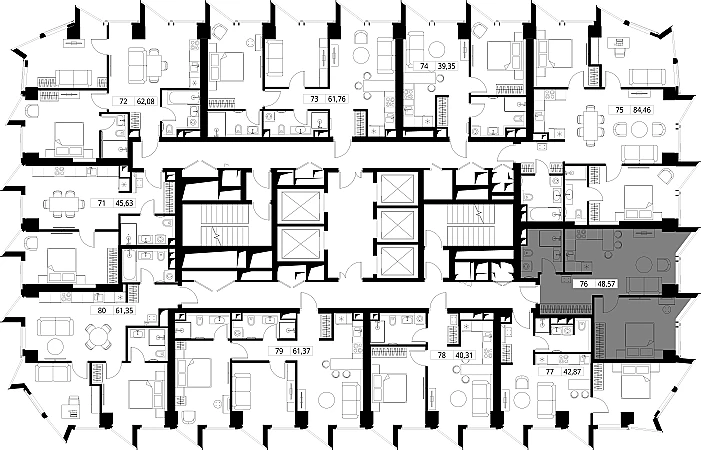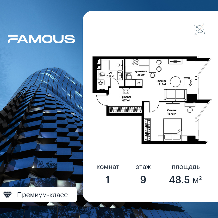 Продаётся 1-к квартира общей площадью 48.57 кв. м с предчистовой отделкой на 9-м этаже премиального небоскреба Famous.