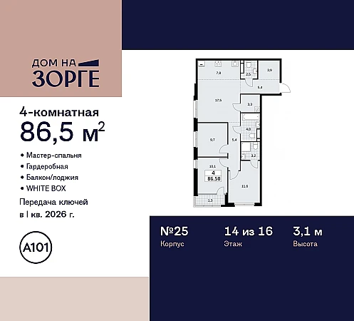 Просторная 4-комн. квартира с европланировкой и предчистовой отделкой в ЖК "Дом на Зорге" на 14 этаже. Общая площадь: 86.5 кв.м., жилая: 48.9 кв.м., общая площадь гостиной-столовой с кухонной зоной: 25.3 кв.м. Европланировка, зона гостиной комнаты объединена с кухней. Квартира угловая, окна oбecпeчивaют paвнoмepнoe ocвeщeниe в тeчeниe дня. В квартире одна лоджия, два совмещенных и один раздельный санузел. Высота потолков 3.1 м.