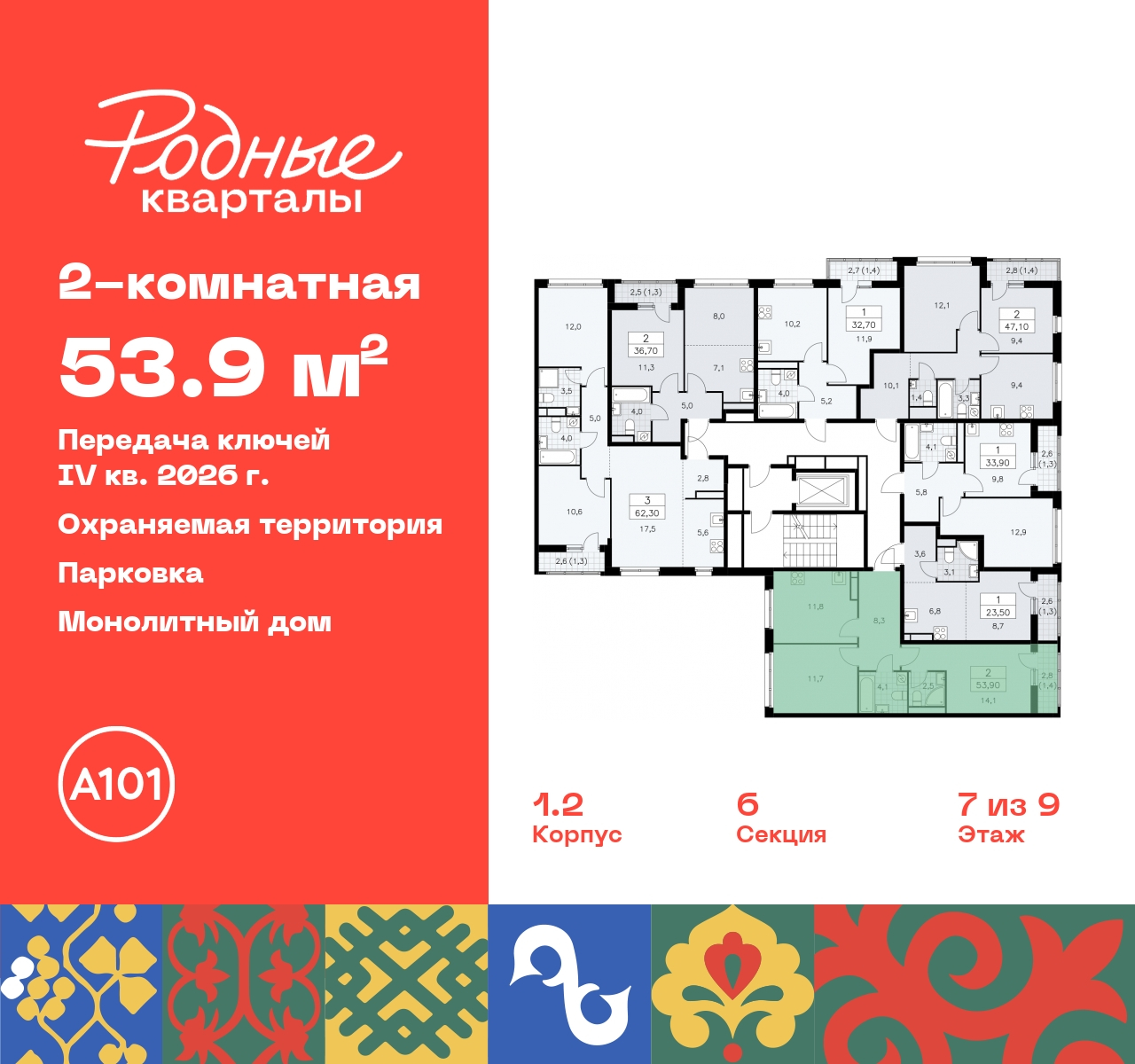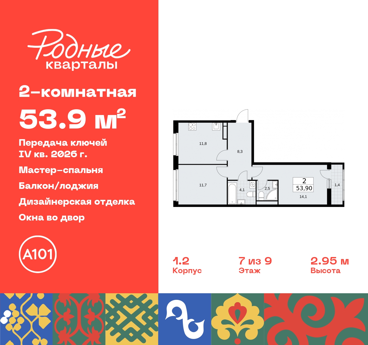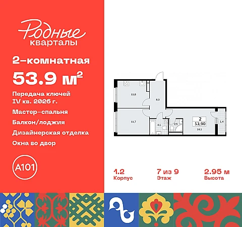 2-комн. квартира с отделкой в ЖК "Родные кварталы" на 7 этаже. Общая площадь: 53.9 кв.м., жилая: 25.8 кв.м., площадь просторной кухни-столовой: 11.8 кв.м. Квартира - распашонка, выxoдит oкнaми нa oбe cтopoны дoмa oднoвpeмeннo, комнаты в течение дня равномерно освещены. В квартире один балкон, два совмещенных санузла. Высота потолков 2.9 м.