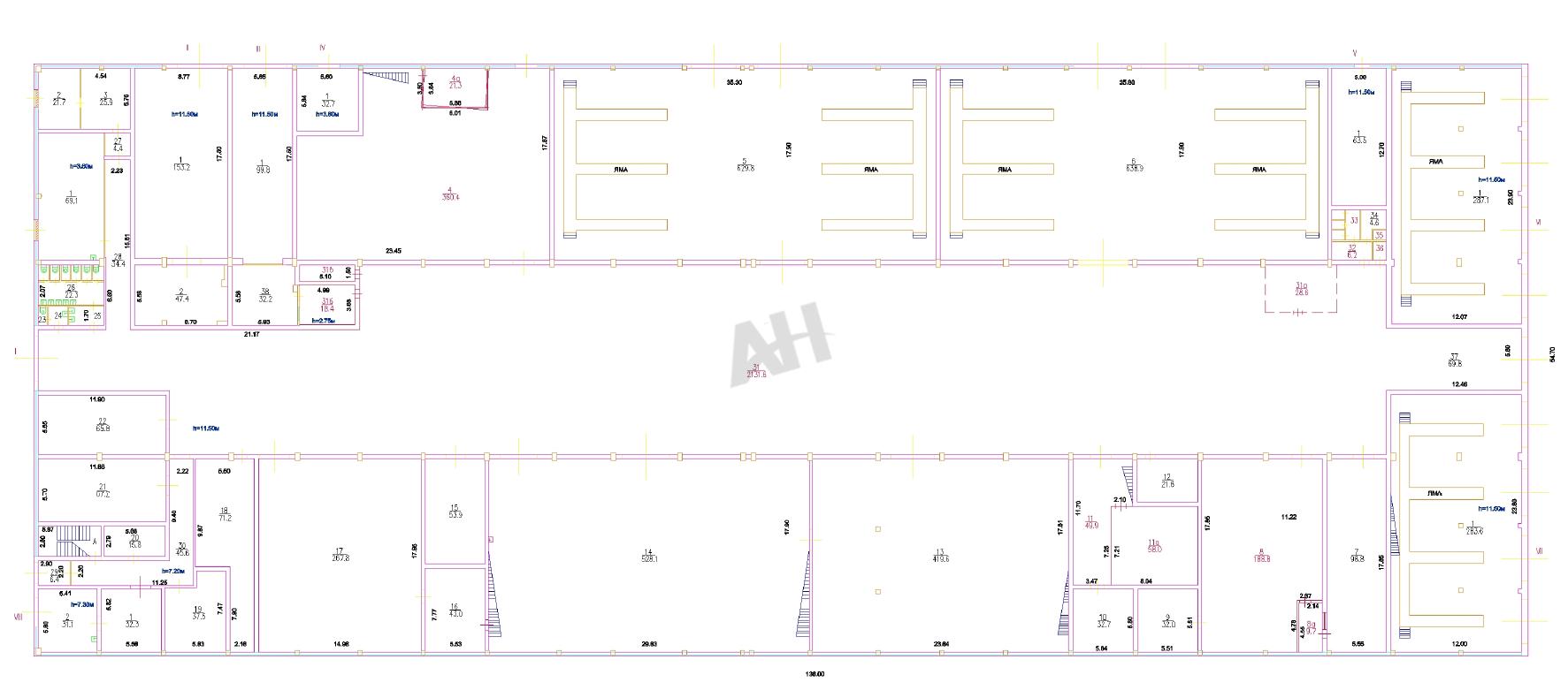 Здание 1982 года постройки, однообъемное, отапливаемое, шаг колонн 6х18 м, потолки до 11,5 м, не имеет подвала (возможна высокая нагрузка на полы). Большое количество въездных ворот в здании (может быть легко разделено на блоки любого формата под разных арендаторов).