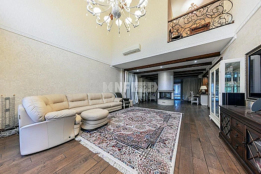 В доме площадью в 515 м² расположены гостиная с камином и вторым светом, зона отдыха, кухня-столовая с выходом на закрытую веранду, хозяйская спальная с террасой и просторная мансарда.