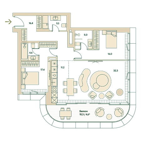 Трёхкомнатная wellness-резиденция площадью 109.3 кв. м. на 8 этаже с видом на двор и центр в доме премиум-класса Springs.