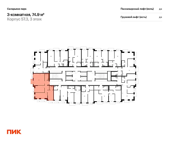 Продаётся 3-комн.квартира площадью 74.90 кв.м на 3 этаже 22 этажного дома (Корпус 57.3, секция 3) проекта ПИК Саларьево парк. Светлый просторный подъезд на уровне земли, функциональная планировка, большие окна, с отделкой.