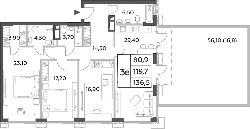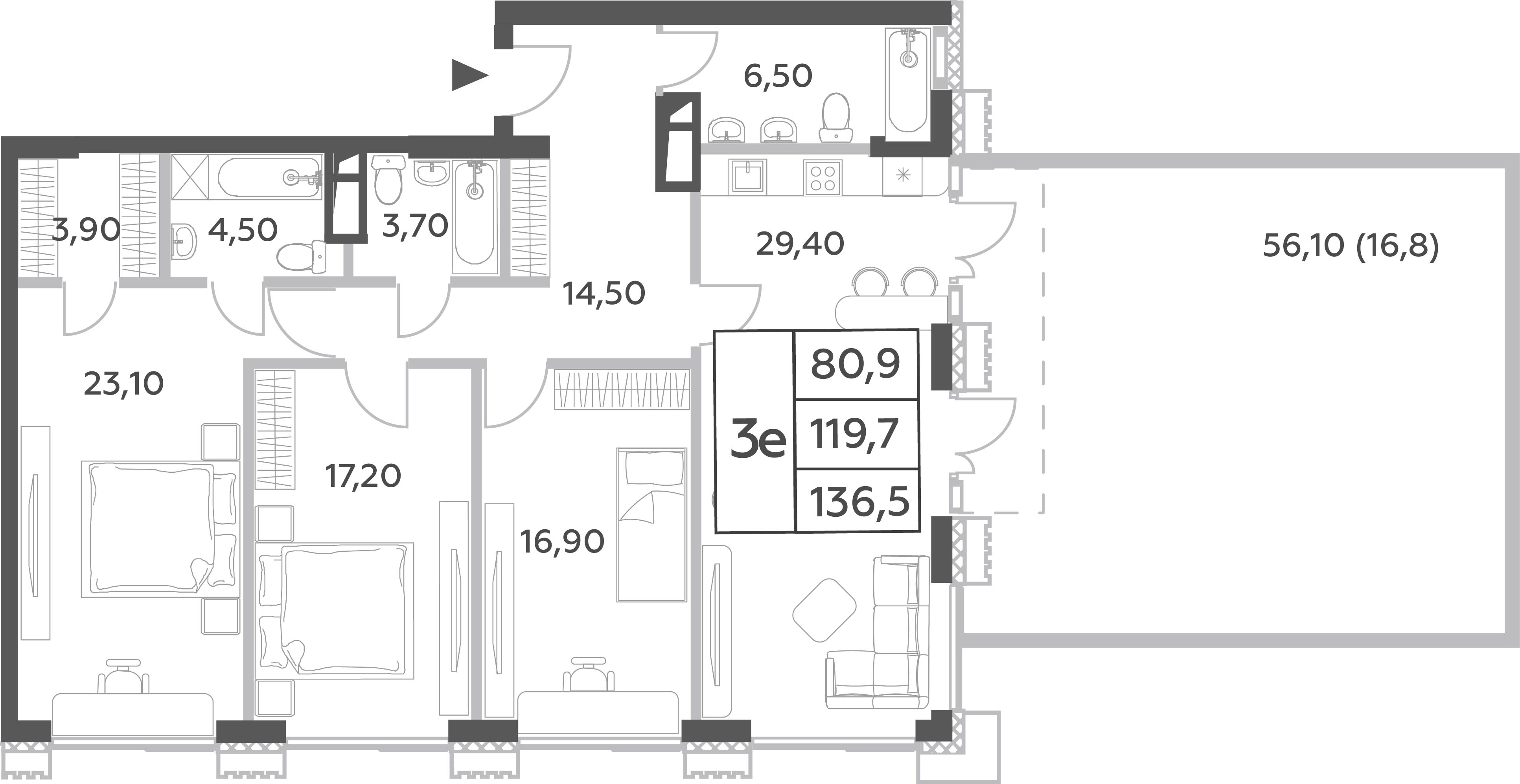 Общая площадь квартиры – 136,5 м2. Высота потолков 3,1 м. создают дополнительный простор, панорамные окна Schuco 2,7 м с предусмотренной функцией проветривания, наполнят вашу квартиру светом и свежим воздухом. Функциональная, продуманная планировка позволит уютно разместиться молодой семье с детьми: большая кухня-гостиная, две отдельные комнаты, современная мастер-спальня с собственной ванной комнатой, два санузла . Наличие собственной террасы 56,1 м позволит расширить полезную площадь квартиры. А благодаря живописным открывающимся видам на Москва-Сити,МГУ, ландшафтный заказник "Долина реки Раменки" , она станет излюбленным местом в квартире для всей семьи . На этаже расположены кладовые помещения.