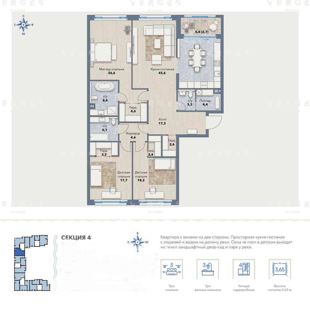 9723 Продаётся шикарная 4 х комнатная квартира в закрытом,охраняемом посёлке Заречье. В квартире выполнен дорогой ремонт , где продуманно все до мелочей . Кухня с гостиной, спальня со своей гардеробной , кабинет и гостевая комната включают в себя все необходимое для жизни . Вся квартира укомплектована дорогой техникой .2 санузла с дорогой сантехникой Прямая продажа , один собственник .Имеется машиноместо в подземном паркинге .