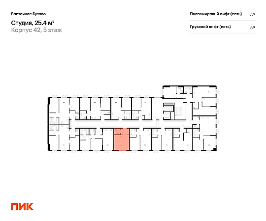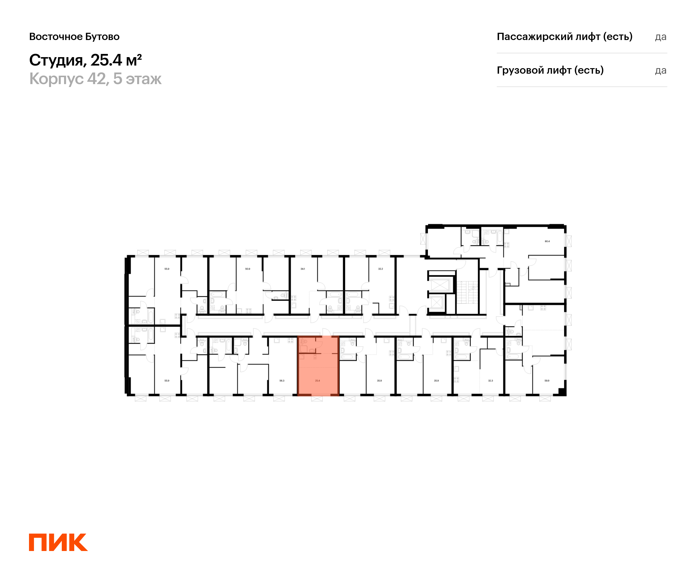 Продаётся квартира-студия площадью 25.10 кв.м на 5 этаже 16 этажного дома (Корпус 42, секция 2) проекта ПИК Восточное Бутово. Светлый просторный подъезд на уровне земли, функциональная планировка, большие окна, с отделкой.
