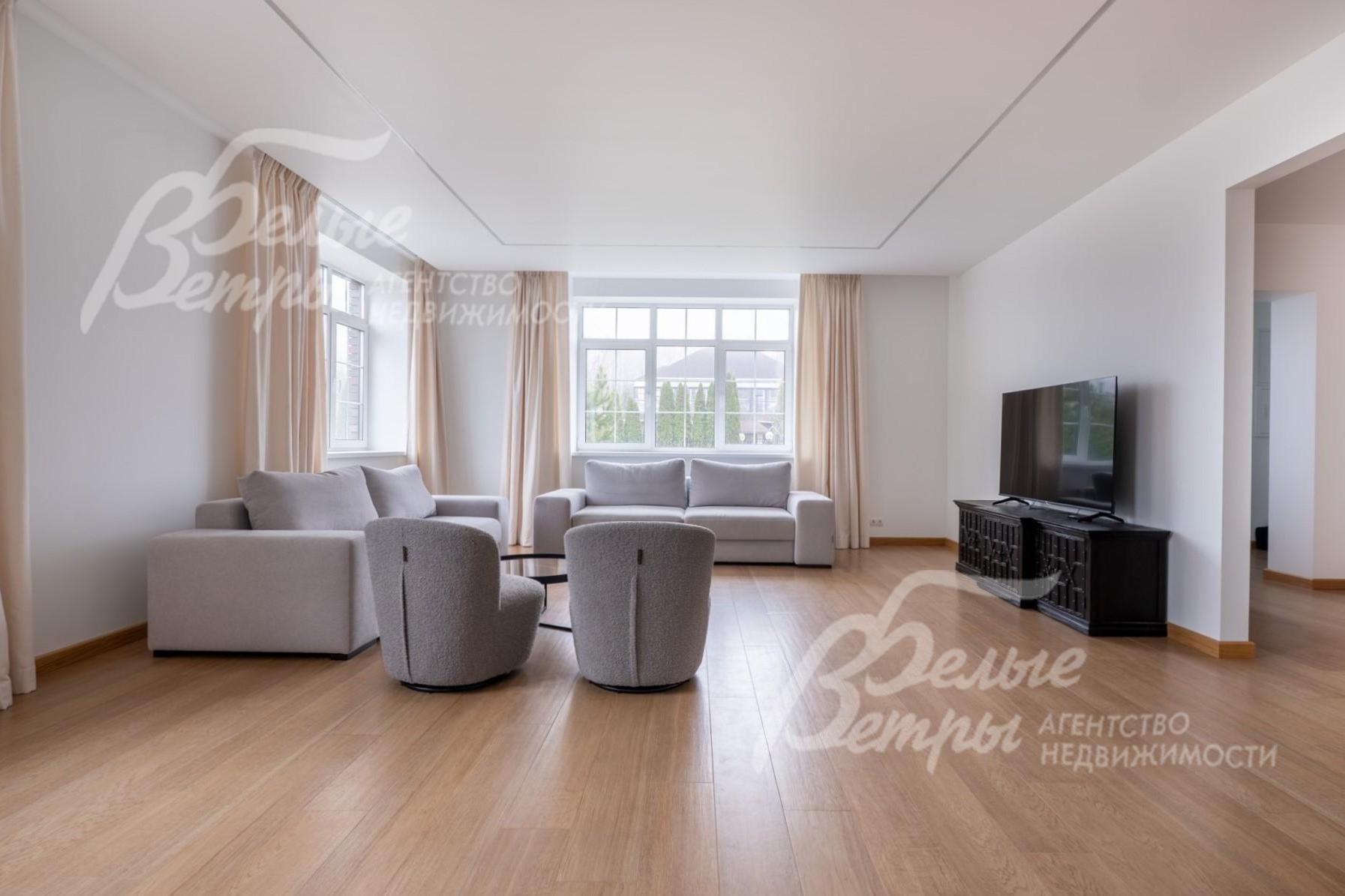 Мебель, оборудование: установлена стильная кухня с белыми матовыми фасадами и каменной столешницей, со встроенной техникой Gorenje (холодильник, индукционная плита, духовой шкаф, посудомойка, СВЧ), чайник. Стиральная машина Hisense с загрузкой 10 кг и стиральная машина Hisense с загрузкой на 9 кг с функцией сушки, пылесос, гладильная доска, утюг, большой телевизор Hisense в гостиной. В гостиной несколько дизайнерских диванов и кресел, в зоне столовой обеденный стол и стулья на 6 персон. В спальнях шкафы, кровати, тумбы, частично мебель (комод, консоль) от фирмы DANTONE, а также от поставщика элитной мебели Home Concept (разных производителей). Во всех помещениях занавески, шторы, светильники, дизайнерские люстры..