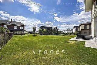 Благоустройство участка: ровный участок с ухоженным газоном и высаженными деревьями: ели, декоративные кустарники. Выложена дорожка к входной группе. По фасаду участка - кованый забор в единой стилистике поселка, с 3-х сторон - светопрозрачное ограждение..