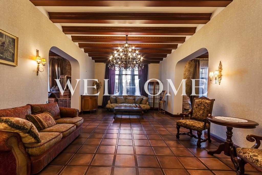 Гостиная: Насладитесь уютом с дровяным камином, витражами ручной работы и роскошной хрустальной люстрой.