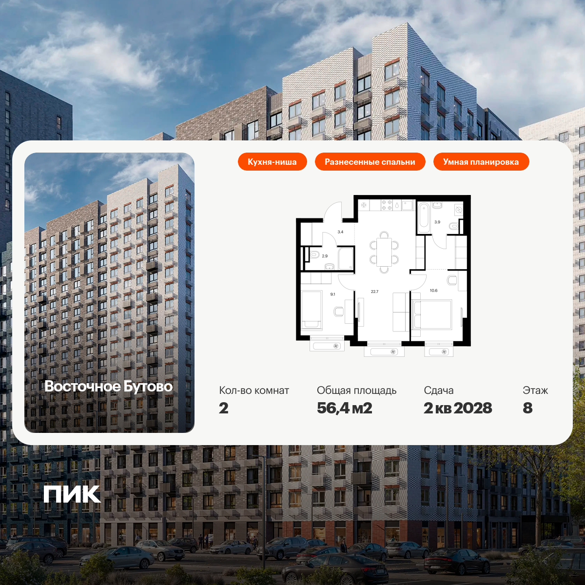 Купить 2к квартиру 56 м² в ЖК Восточное Бутово
