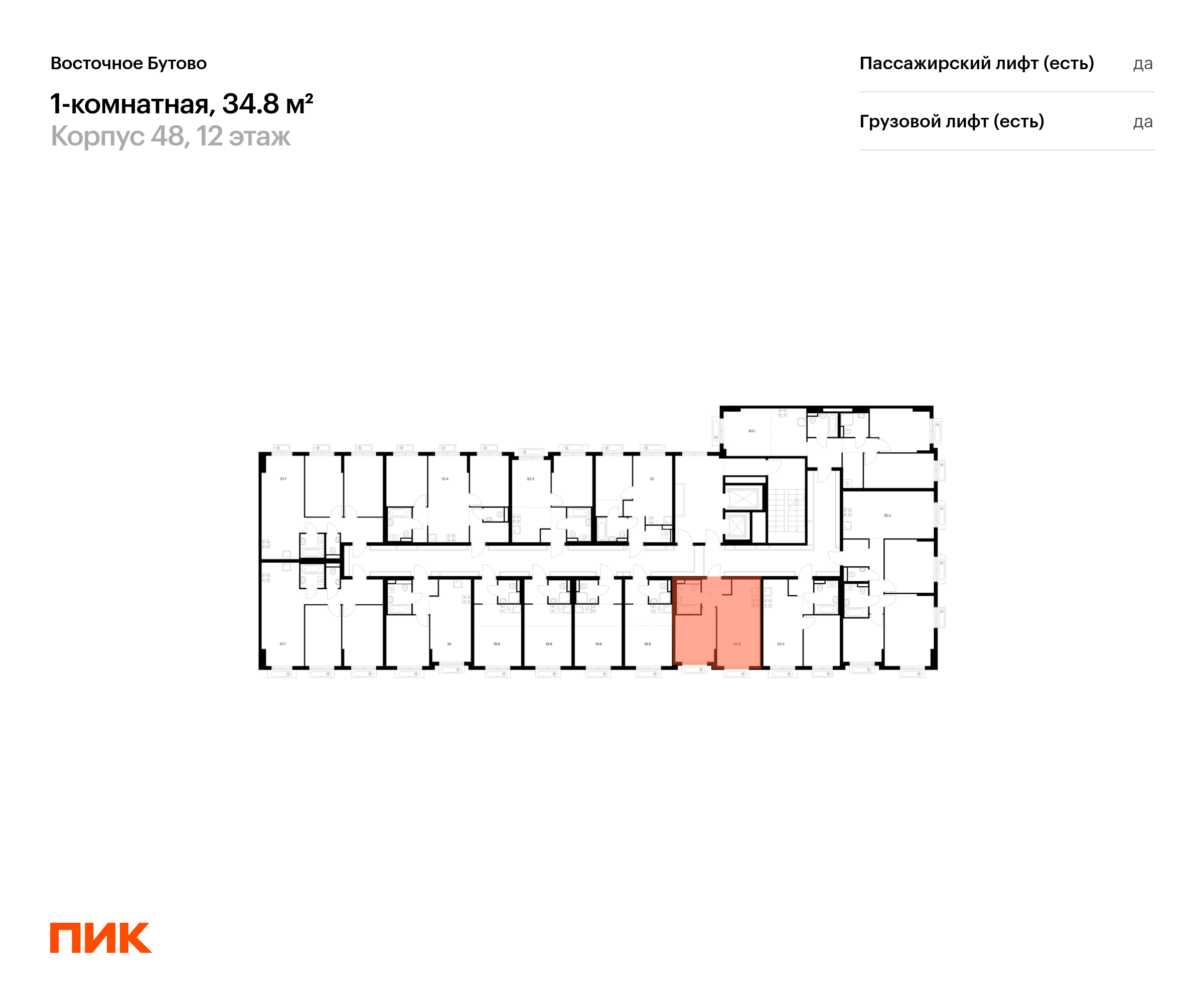 Продаётся 1-комн.квартира площадью 34.80 кв.м на 12 этаже 17 этажного дома (Корпус 48, секция 2) проекта ПИК Восточное Бутово. Светлый просторный подъезд на уровне земли, функциональная планировка, большие окна, с отделкой.