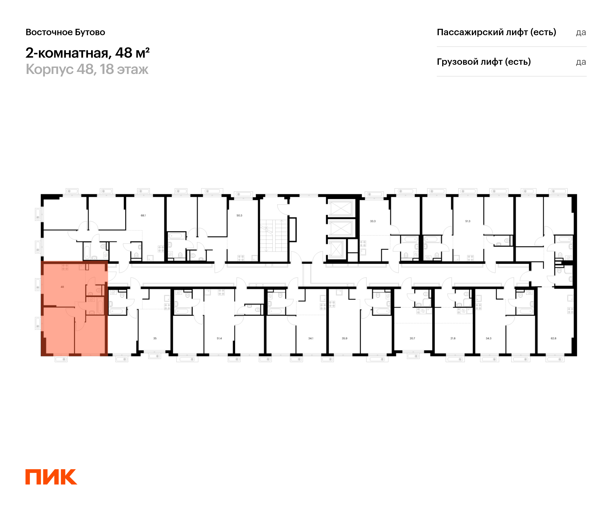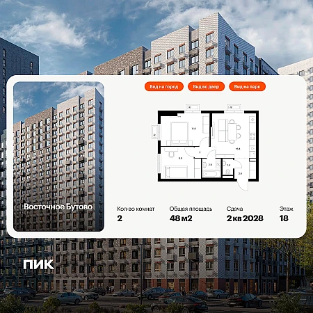 Продаётся 2-комн.квартира площадью 48.00 кв.м на 18 этаже 25 этажного дома (Корпус 48, секция 4) проекта ПИК Восточное Бутово. Светлый просторный подъезд на уровне земли, функциональная планировка, большие окна, с отделкой.