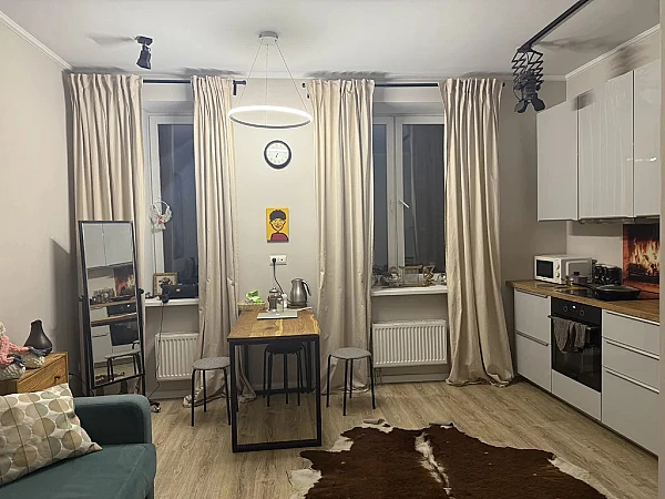 Просторная кухня- гостиная, 2 сан узла, спальня с гардеробной. Полы с подогревом, окна на две стороны.