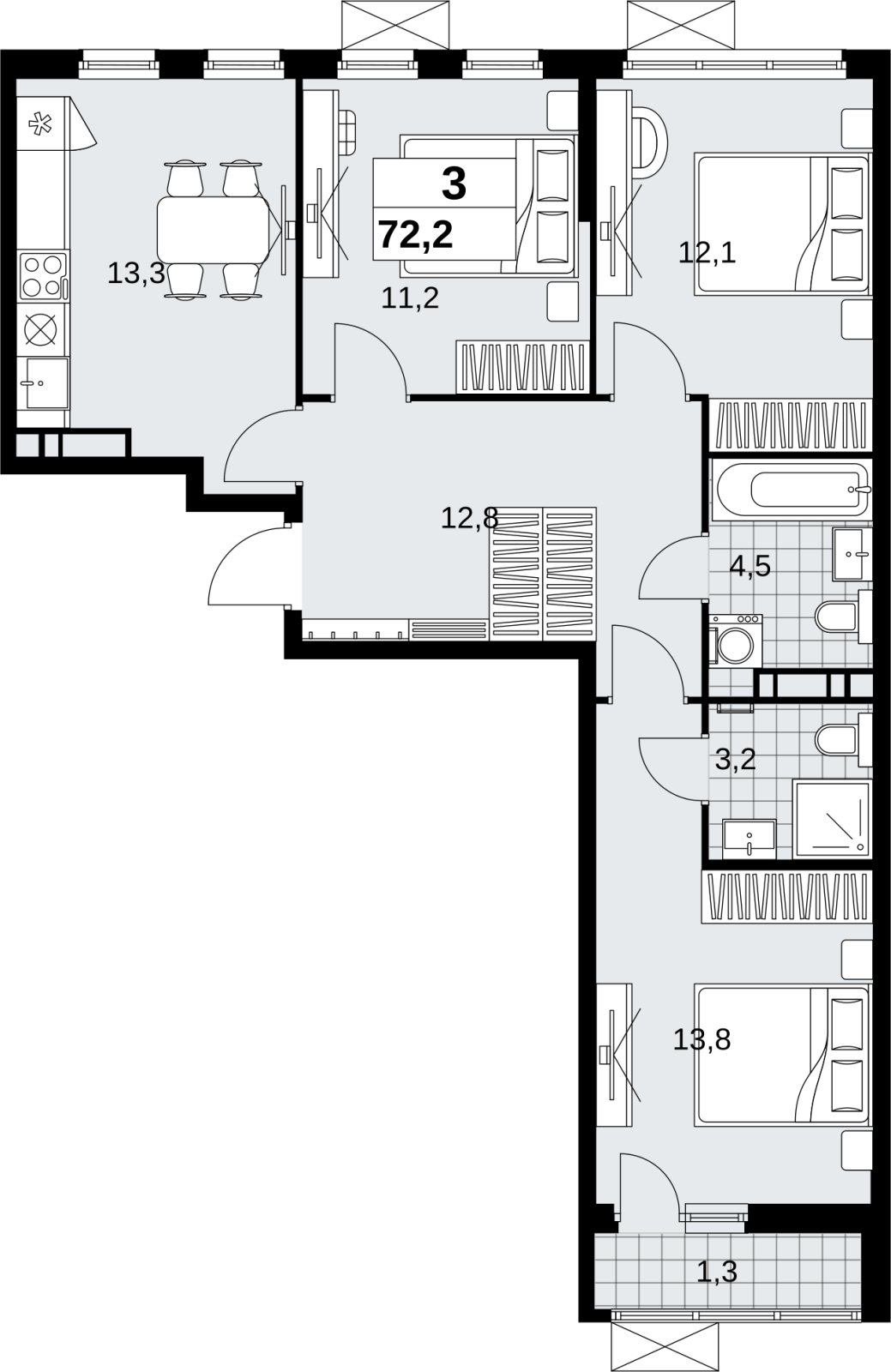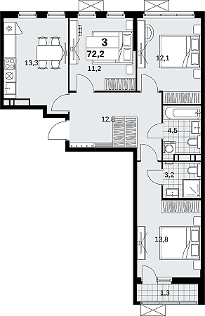 3-комн. квартира площадью 72.2 кв.м., с отделкой, на 9 этаже из 12 в жилом комплексе комфорт-класса "Скандинавия". Квартира - распашонка, без проходных комнат, окна однорвеменно смотрят во двop и на yлицy. В квартире один балкон, два совмещенных санузла. Высота потолков 2.95 м.
