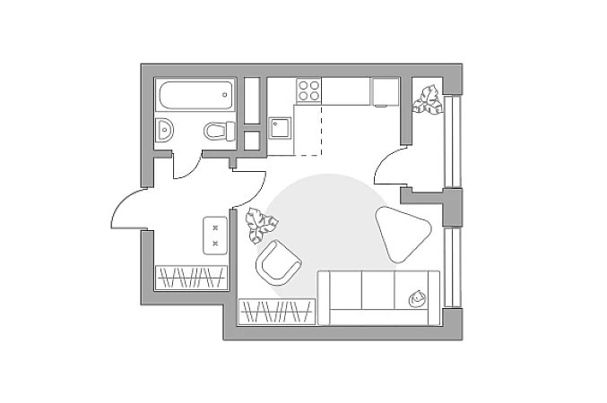 Жилая площадь 19.76 м2, кухня 1.98 м2, квартира без отделки, комнаты смежные, лоджий - 1, окна выходят во двор.