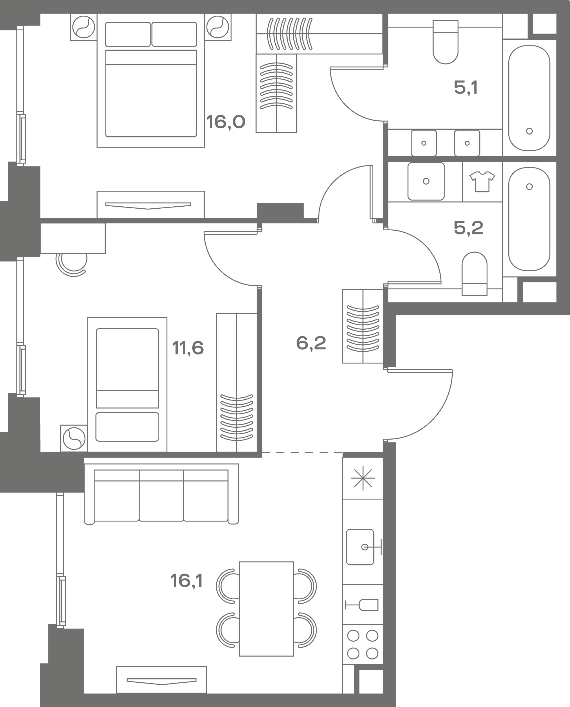 Квартиры с панорамными окнами, мастер-спальнями, гардеробными, классическими балконами и лоджиями, видовыми террасами. Высота потолков от 2,9 до 3,5 м.