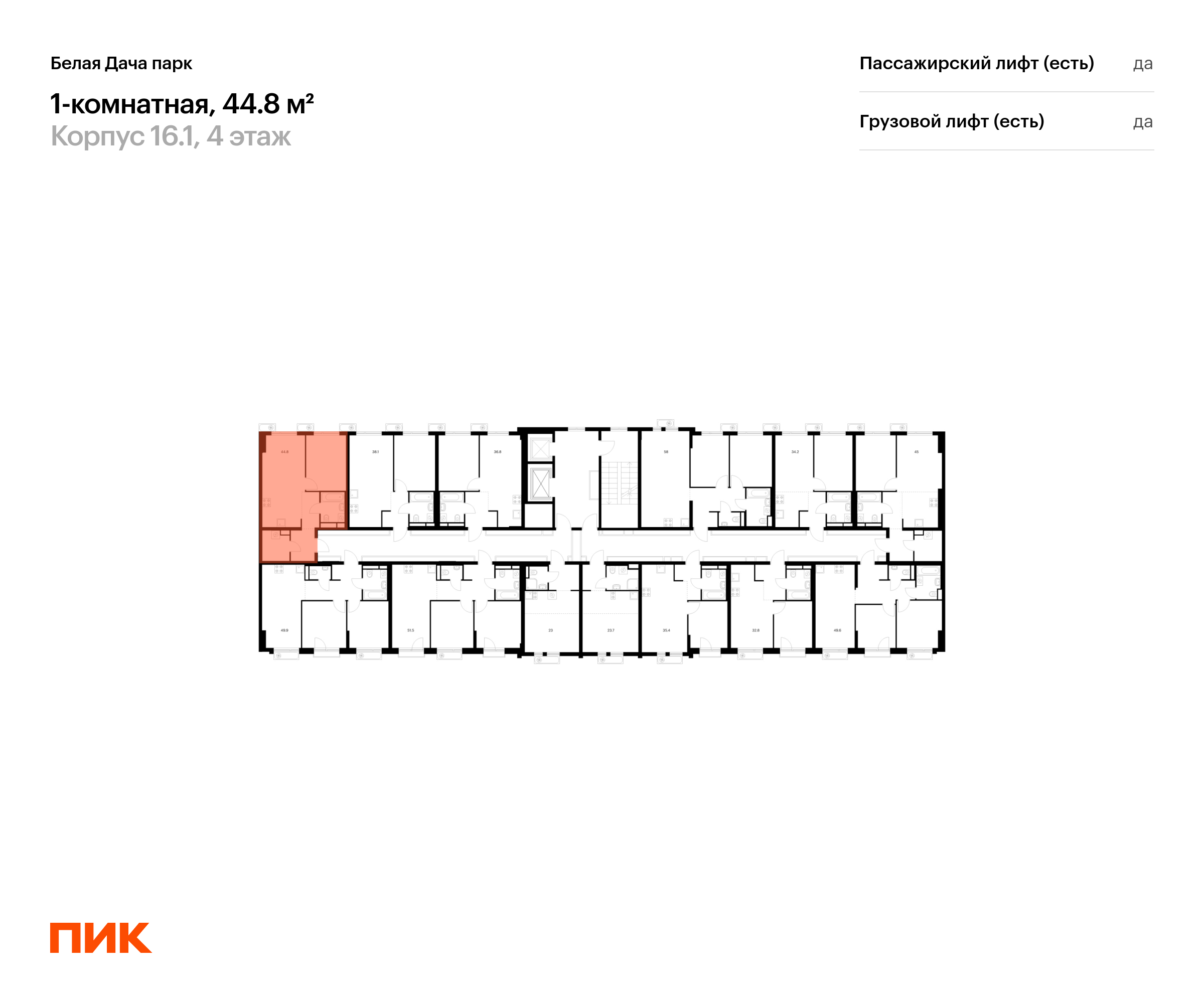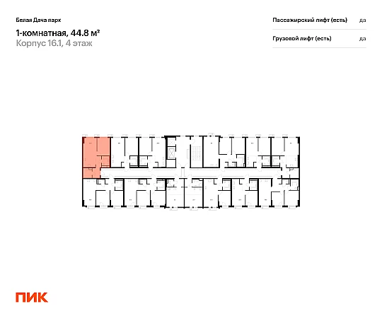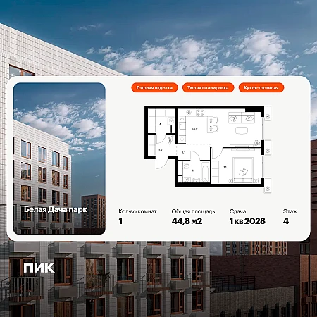 Продаётся 1-комн.квартира площадью 44.80 кв.м на 4 этаже 14 этажного дома (Корпус 16.1, секция 2) проекта ПИК Белая Дача парк. Светлый просторный подъезд на уровне земли, функциональная планировка, большие окна, с отделкой.