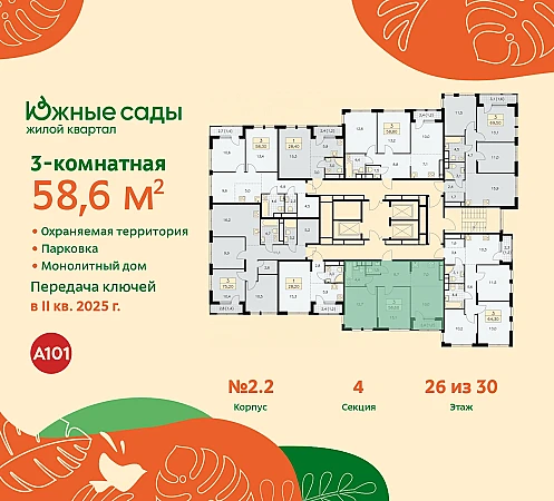 3-комн. квартира с европланировкой и предчистовой отделкой в ЖК "Южные сады" на 26 этаже. Общая площадь: 58.6 кв.м., жилая: 35.8 кв.м., суммарная площадь гостиной-столовой с кухонной зоной: 17 кв.м. Европейская планировка, кухня и гостиная объединены в одно просторное помещение. Комнаты изолированные, все окна выходят на одну сторону. В квартире одна лоджия, один совмещенный и один раздельный санузел. Высота потолков 2.87 м.