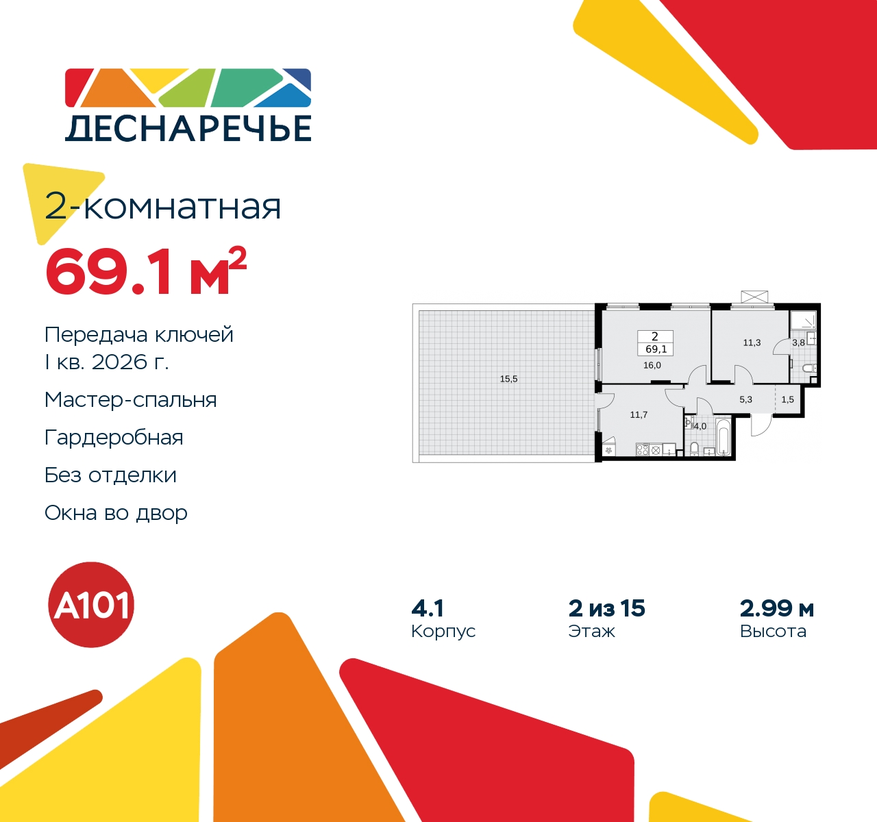 Двухкомнатная квартира от застройщика в ЖК "Деснаречье" на 2 этаже. Квартира без отделки, после получения ключей можно делать ремонт. Общая площадь: 69.1 кв.м., жилая: 27.3 кв.м., площадь просторной кухни-столовой: 11.7 кв.м. Квартира угловая, идеально подойдет любителям тишины и панорамных видов. В квартире один балкон, два совмещенных санузла. Наличие террасы размером 15.5 кв.м. в квартире дает возможность для создания зон отдыха в кругу семьи и друзей. Высота потолков 2.99 м.
