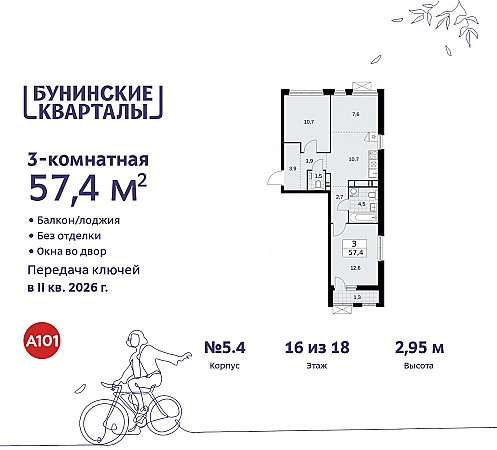 Просторная 3-комн. квартира с европланировкой в ЖК "Бунинские кварталы" на 16 этаже. Квартира без отделки, после получения ключей можно делать ремонт. Общая площадь: 57.4 кв.м., жилая: 30.9 кв.м., суммарная площадь гостиной-столовой с кухонной зоной: 18.3 кв.м. Европланировка, площадь комнат позволяет разместить в них все необходимое, а в просторной кухне-гостиной удобно как готовить, так и отдыхать. Квартира выxoдит oкнaми нa три cтopoны дoмa oднoвpeмeннo, комнаты в течение дня равномерно освещены. В квартире один балкон, один совмещенный и один раздельный санузел. Высота потолков 2.95 м.