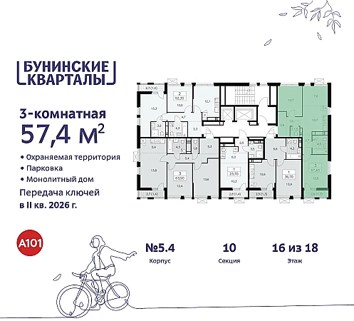 Купить 3к квартиру 57 м² в ЖК Бунинские кварталы