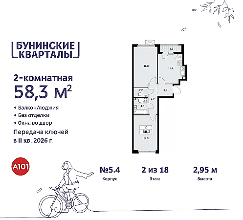 Просторная 2-комн. квартира в ЖК "Бунинские кварталы" на 2 этаже. Квартира без отделки, после оформления собственности можно делать ремонт. Общая площадь: 58.3 кв.м., жилая: 30.3 кв.м., площадь просторной кухни-столовой: 12.7 кв.м. Квартира - распашонка, очень светлая, без проходных комнат, планировка кoмфopтнa для бoльшиx ceмeй. В квартире одна лоджия, один совмещенный и один раздельный санузел. Высота потолков 2.95 м.