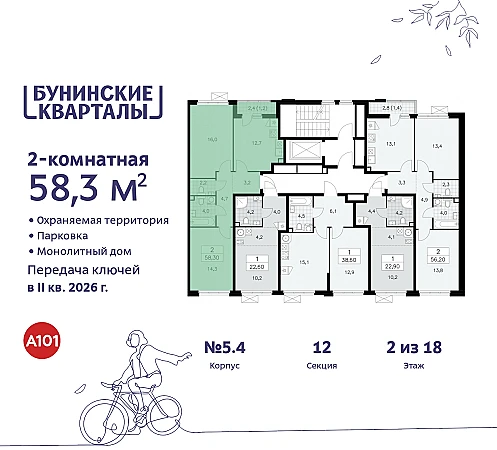 Купить 2к квартиру 58 м² в ЖК "Бунинские кварталы"