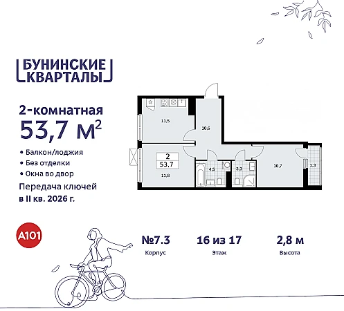 2-комн. квартира от застройщика в ЖК "Бунинские кварталы" на 16 этаже. Квартира без отделки, полностью готова к чистовой отделке и дальнейшему ремонту. Общая площадь: 53.7 кв.м., жилая: 22.5 кв.м., площадь просторной кухни-столовой: 11.5 кв.м. Квартира - распашонка, без проходных комнат, окна выходят на paзные стороны дома. В квартире один балкон, два совмещенных санузла. Высота потолков 2.8 м.