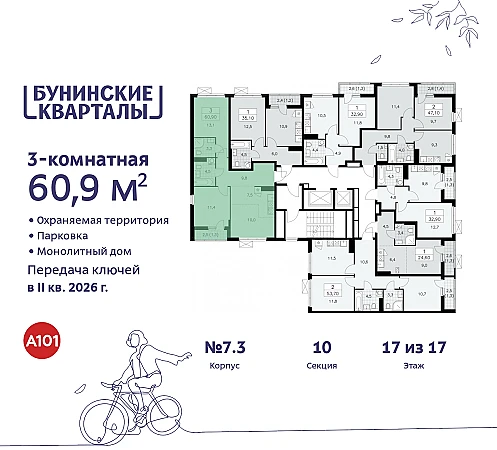 Дом монолитный, многоподъездный, переменной этажности, от 9 до 17 этажей. Квартира находится во 2-й секции высотой 17 этажей в корпусе 7.3. На этаже 7 квартир. В подъезде 1 пассажирский и 1 грузовой лифт. Начало строительства - 4 квартал 2023 года. Окончание строительства - 2 квартал 2026 года. Оформление сделки по договору долевого участия.