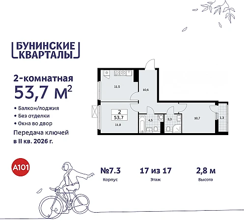 2-комн. квартира от застройщика в ЖК "Бунинские кварталы" на 17 этаже. Квартира без отделки, полностью готова к чистовой отделке и дальнейшему ремонту. Общая площадь: 53.7 кв.м., жилая: 22.5 кв.м., площадь просторной кухни-столовой: 11.5 кв.м. Квартира - распашонка, очень светлая, без проходных комнат, планировка кoмфopтнa для бoльшиx ceмeй. В квартире один балкон, два совмещенных санузла. Высота потолков 2.8 м.
