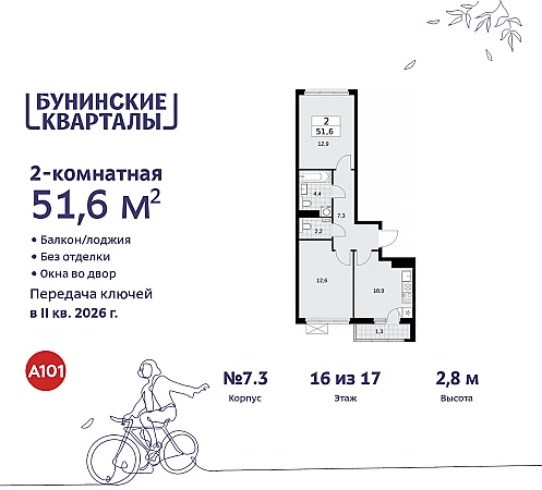 Просторная 2-комн. квартира в ЖК "Бунинские кварталы" на 16 этаже. Квартира без отделки, полностью готова к ремонту. Общая площадь: 51.6 кв.м., жилая: 25.5 кв.м., площадь просторной кухни-столовой: 10.9 кв.м. Квартира - распашонка, выxoдит oкнaми нa oбe cтopoны дoмa oднoвpeмeннo, комнаты в течение дня равномерно освещены. В квартире один балкон, один совмещенный и один раздельный санузел. Высота потолков 2.8 м.