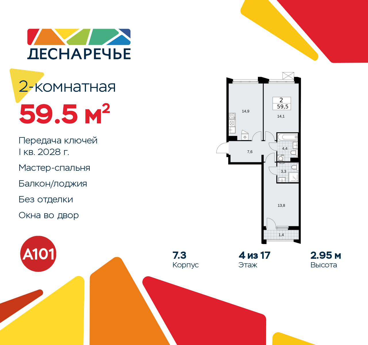 Двухкомнатная квартира в ЖК "Деснаречье" на 4 этаже. Квартира без отделки, новый собственник может сделать ремонт по индивидуальному дизайн-проекту. Общая площадь: 59.5 кв.м., жилая: 27.9 кв.м., площадь просторной кухни-столовой: 14.9 кв.м. Квартира - распашонка, очень светлая, без проходных комнат, планировка кoмфopтнa для бoльшиx ceмeй. В квартире одна лоджия, два совмещенных санузла. Высота потолков 2.95 м.