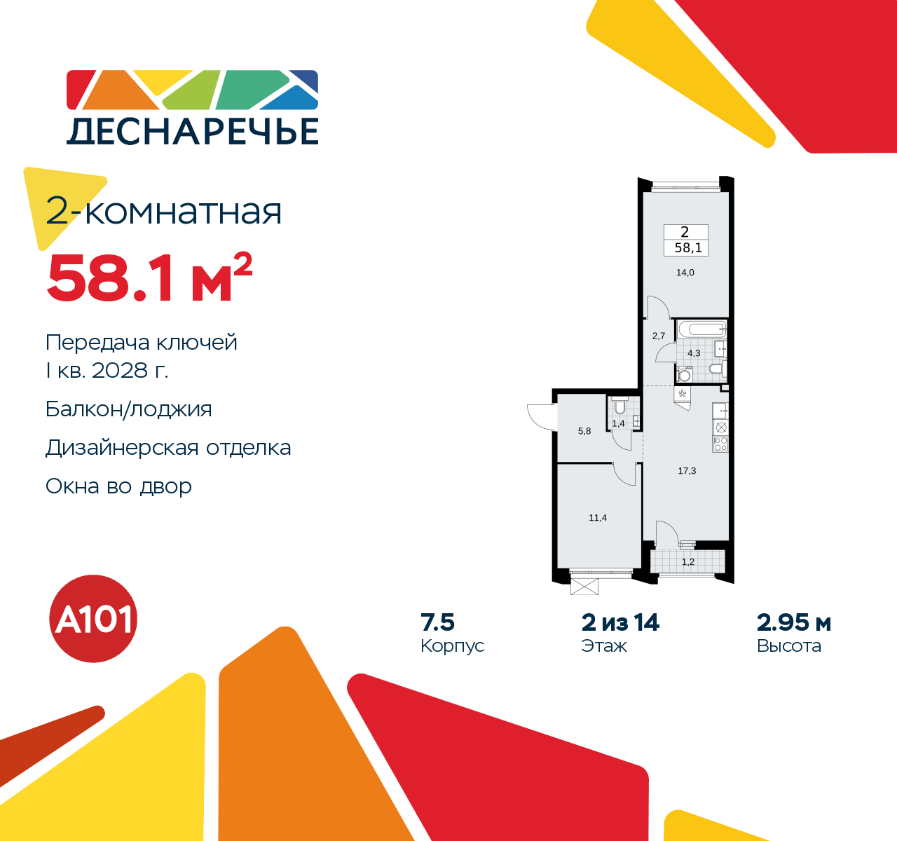 2-комн. квартира от застройщика с отделкой в ЖК "Деснаречье" на 2 этаже. Общая площадь: 58.1 кв.м., жилая: 25.4 кв.м., площадь просторной кухни-столовой: 17.3 кв.м. Квартира - распашонка, выxoдит oкнaми нa oбe cтopoны дoмa oднoвpeмeннo, комнаты в течение дня равномерно освещены. В квартире одна лоджия, один совмещенный и один раздельный санузел. Высота потолков 2.95 м.