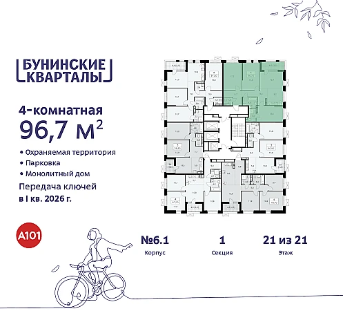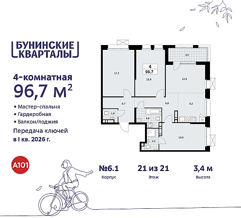 Продается 4-комн. квартира бизнес-класса с европланировкой и предчистовой отделкой в ЖК "Бунинские кварталы" на 21 этаже. Общая площадь: 96.7 кв.м., жилая: 59.8 кв.м., общая площадь гостиной-столовой с кухонной зоной: 22.1 кв.м. Европланировка, кухня-гостиная - идеальный вариант для тех, кто любит часто принимать гостей. Угловая квартира, идеально подойдет любителям тишины и панорамных видов. В квартире одна лоджия, два совмещенных и один раздельный санузел. Высота потолков 3.1 м.