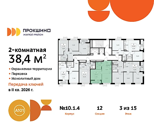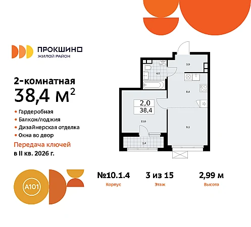 Продается 2-комн. квартира с европланировкой и предчистовой отделкой в ЖК "Прокшино" на 3 этаже. Общая площадь: 38.4 кв.м., жилая: 20.7 кв.м., суммарная площадь гостиной-столовой с кухонной зоной: 17.5 кв.м. Европейская планировка, за счет большой площади кухни-гостиной квартира выглядит просторной и очень удобна для жизни. Комнаты изолированные, все окна выходят на одну сторону. В квартире одна лоджия, один совмещенный санузел. Высота потолков 2.99 м.