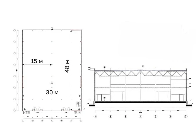 Двухпролетная система 15х2 с шагом 6 , ряд колонн по центру. Складская зона 30х42. Пристроенная АБК в 2 этажа 9х12 с шагом 4,5х6, в центре 1 колонна.