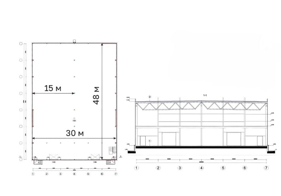Двухпролетная система 15х2 с шагом 6 , ряд колонн по центру. Складская зона 30х42. Пристроенная АБК в 2 этажа 9х12 с шагом 4,5х6, в центре 1 колонна.