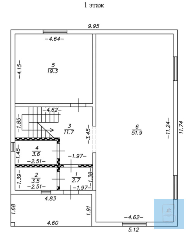 - 1 этаж: Крыльцо, прихожка, бойлерная, санузел, коридор, спальня 19,3 кв.м. , кухня-гостиная 51,9 кв.м.