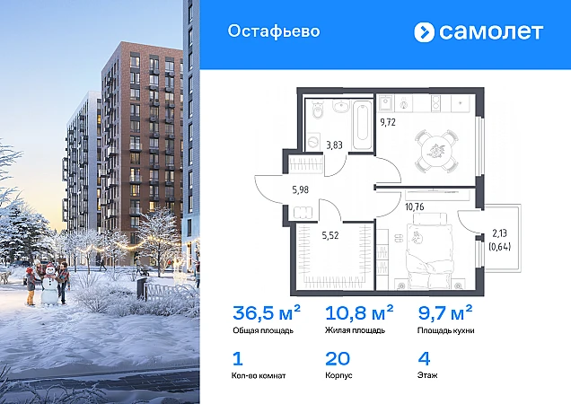 Строим кварталы для жизни с заботой о будущем. Предлагается 1-комнатная квартира комфорт-класса 36,45 кв.м в корпусе 20 на 4 этаже, в ЖК «Остафьево»