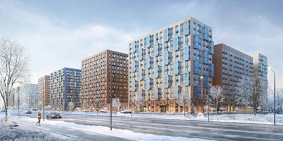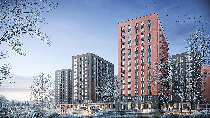 В квартале — монолитные дома комфортной высоты, от 10 этажей. Светлые фасады украшают кирпичные вставки в теплых природных оттенках.