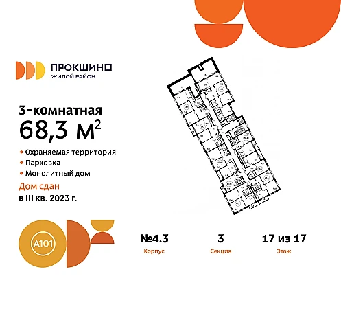 3-комн. квартира от застройщика в ЖК "Прокшино" на 17 этаже. Квартира без отделки, после получения ключей можно делать ремонт. Общая площадь: 68.3 кв.м., жилая: 34.5 кв.м., площадь кухни: 7.1 кв.м. Угловая квартира, идеально подойдет любителям тишины и панорамных видов. В квартире один балкон, один совмещенный и один раздельный санузел. Наличие террасы площадью 7.7 кв.м. в квартире дает возможность для обустройства дополнительной площади. Высота потолков 2.99 м.