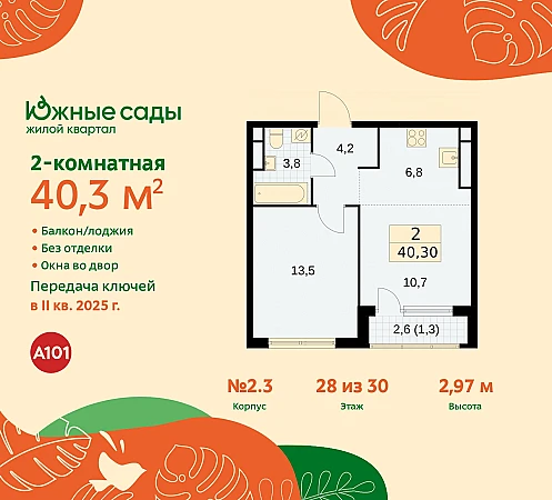 2-комн. квартира с европланировкой в ЖК "Южные сады" на 28 этаже. Квартира без отделки, после оформления собственности можно делать ремонт. Общая площадь: 40.3 кв.м., жилая: 24.2 кв.м., суммарная площадь гостиной-столовой с кухонной зоной: 17.5 кв.м. Европланировка, кухня-гостиная - идеальный вариант для тех, кто любит часто принимать гостей. Комнаты изолированные, все окна выходят на одну сторону. В квартире одна лоджия, один совмещенный санузел. Высота потолков 2.87 м.
