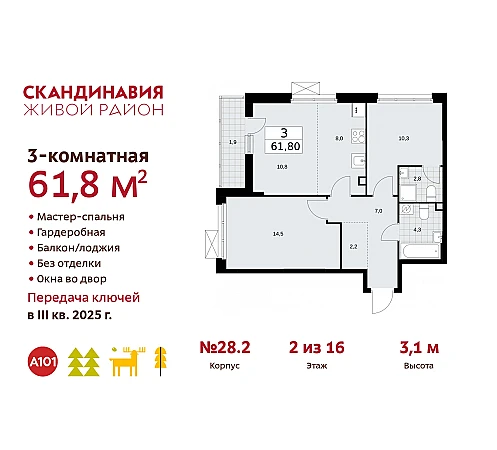 Купить 3к квартиру 61 м² в ЖК "Скандинавия"