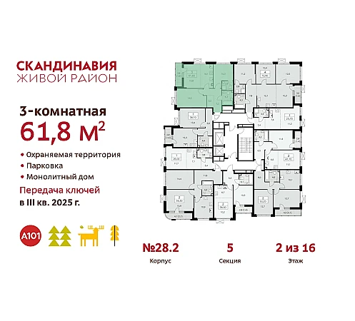 Квартира находится в корпусе 28.2. Дом монолитный, одноподъездный, высотой 16 этажей. На этаже 9 квартир. В подъезде 1 пассажирский и 1 грузовой лифт. Начало строительства - 2 квартал 2023 года. Окончание строительства - 4 квартал 2025 года. Оформление сделки по договору долевого участия.