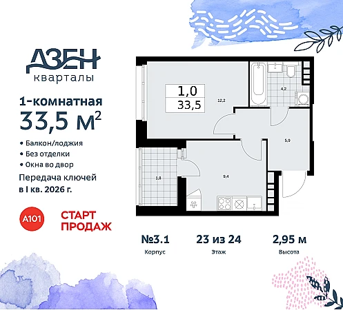 Просторная 1-комн. квартира в ЖК "Дзен-кварталы" на 23 этаже. Квартира без отделки, полностью готова к чистовой отделке и дальнейшему ремонту. Общая площадь: 33.5 кв.м., жилая: 12.2 кв.м., площадь просторной кухни-столовой: 9.4 кв.м. Все окна выходят на одну сторону. В квартире одна лоджия, один совмещенный санузел. Высота потолков 2.95 м.