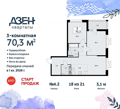 3-комн. квартира бизнес-класса с европланировкой в ЖК "Дзен-кварталы" на 18 этаже. Квартира без отделки, новый владелец может сделать ремонт по индивидуальному проекту. Общая площадь: 70.3 кв.м., жилая: 43.9 кв.м., общая площадь гостиной-столовой с кухонной зоной: 21.7 кв.м. Европланировка, кухня-гостиная - идеальный вариант для тех, кто любит часто принимать гостей. Угловая квартира, очень светлая, естественная вентиляция при открытии окон. В квартире одна лоджия, один совмещенный и один раздельный санузел. Высота потолков 3.1 м.